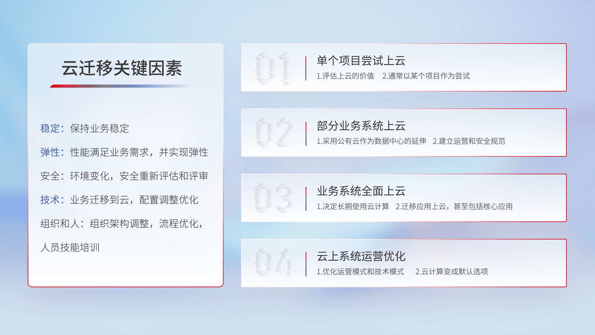 结合实际业务,,,,从规划设计、、、、云平台选型、、云原生改造、、、数据迁移、、、、集成交付,,,,迁移全过程为客户识别最佳上云路径,,,做好风险识别管理,,设计网络架构、、、、身份权限、、、安全审计合规、、操作审计、、、、日志审计、、监控告警策略、、、、多站点容灾设计等,,,对云上基础设施进行整体规划,,提升IT治理水平,,,以满足弹性、、高可用、、、高性能的需求。。。。