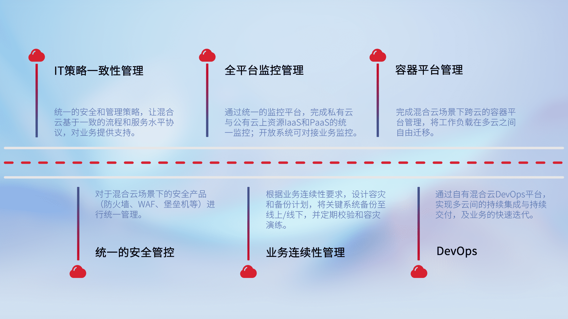 通过多云纳管,,以统一的资源数据模型把客户的云资源进行抽象和封装,,,进而实现对多云资源的统一操作,,,保障云资源管理的可靠性、、稳定性与可用性。。。。量身定制化运维内容,,,,配置、、开发运维、、补丁管理、、备份、、、、监控、、、认证和访问管理、、审计和日常巡检等,,保障在用云过程中的可靠度,,稳定度以及高可用率。。。。