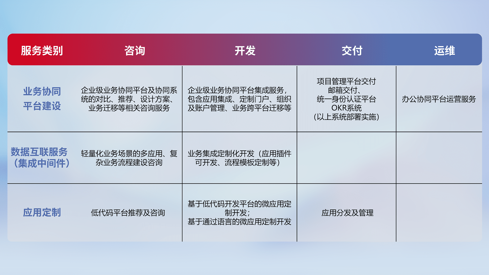 针对钉钉、、企微、、、IDaas等平台级产品提供产品的规划、、、方案、、交付、、、定制化开发等服务,,,实现如统一协同办公、、智能客户服务、、、混合会议管理、、、、智能数据查询、、、、等业务场景,,,实现数字化转型。。。